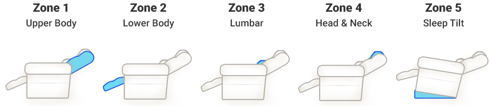 We are now pleased to introduce a new evolution of our Perfect Sleep Chair… the ultimate 5 zone Perfect Sleep Chair. Both the traditional Perfect Sleep Chair and new Perfect Sleep Chair - Ultimate offer the specialized attention to (1) upper body and (2) lower body zones, but the five-motor Perfect Sleep Chair - Ultimate covers other zones as well, to broaden and deepen the restorative functions.